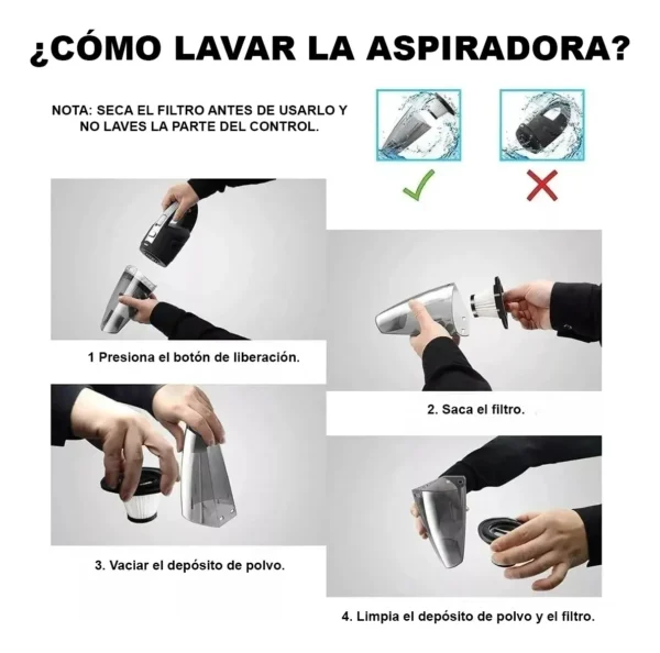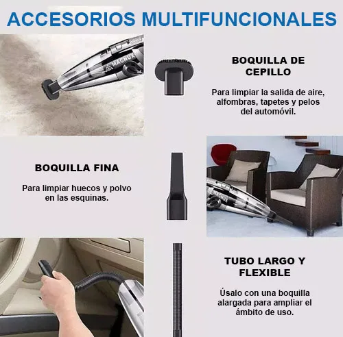Incluye accesorios multifuncionales para adaptarse a diversas necesidades de limpieza, desde estrechar huecos hasta limpiar líquidos derramados y alcanzar lugares difíciles.